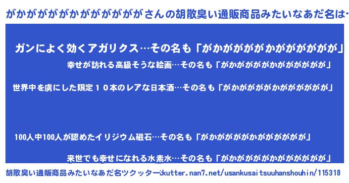 | 男性向けラノベタイトル風あだ名 | 『この素晴らしい世界にがかががががかががががががを!』 |
