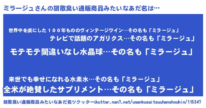 | 意味不明あだ名 | 『ペロリンミラージュ』『自称ミラージュ』 |