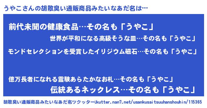 | ヘコむあだ名 | 『うやこ(笑)』『うやぷりん』『豆乳』 |