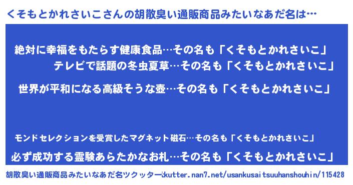 | 欧米人風あだ名 | 『トリンドルくそもとかれさいこ』 |