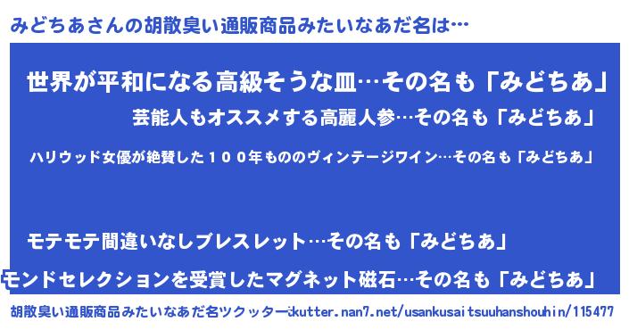 | 意味不明あだ名 | 『住所不定無職みどちあ(9歳)』 |