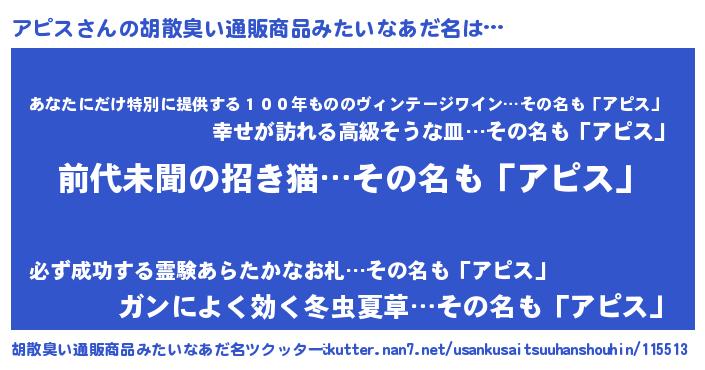 | 意味不明あだ名 | 『永久保存アピス』『自称アピス』 |