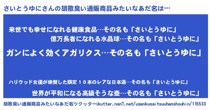 | ヘコむあだ名 | 『さいとうゆに(笑)』『なまこ酢』 |