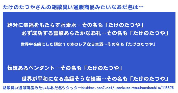 | 意味不明あだ名 | 『住所不定無職たけのたつや(62歳)』 |