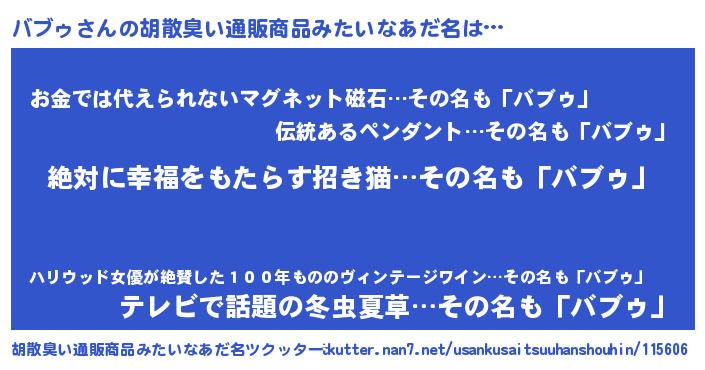 | 男性向けラノベタイトル風あだ名 | 『バブゥという概念が存在しない退屈な世界 』 |