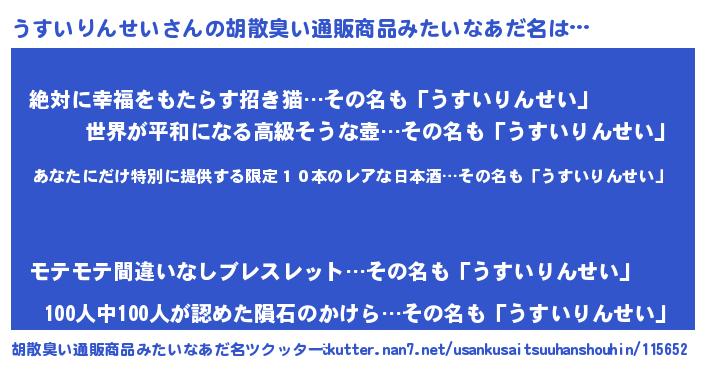 | 男性向けラノベタイトル風あだ名 | 『この素晴らしい世界にうすいりんせいを!』 |
