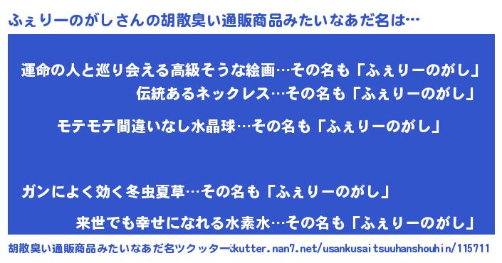 | 男性向けラノベタイトル風あだ名 | 『ふぇりーのがしの憂鬱』 |
