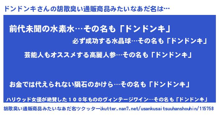 | 男性向けラノベタイトル風あだ名 | 『Re:ドンドンキから始める異世界生活』 |