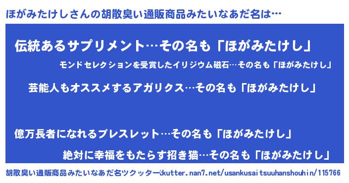 | 意味不明あだ名 | 『自称ほがみたけし』 |