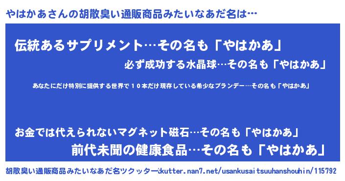 | 意味不明あだ名 | 『住所不定無職やはかあ(86歳)』 |