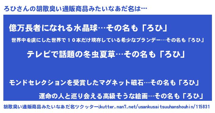 | 欧米人風あだ名 | 『ケンブリッジろひ』『マイケルろひ』 |