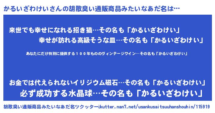 | 男性向けラノベタイトル風あだ名 | 『この素晴らしい世界にかるいざわけいを!』 |