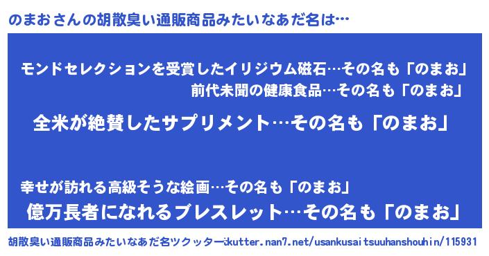 | 女子向けラノベタイトル風あだ名 | 『のまお様がみてる』『死神のまおの再婚』 |
