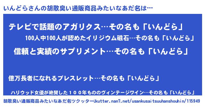 | 男性向けラノベタイトル風あだ名 | 『ダンジョンにいんどらを求めるのは間違っているだろうか』 |