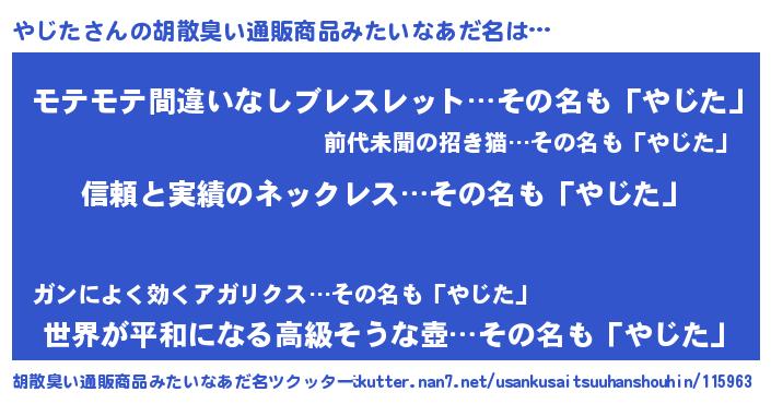 | 男性向けラノベタイトル風あだ名 | 『ヤジタスレイヤー』『やじたの憂鬱』 |