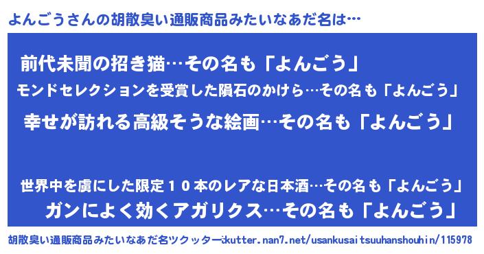 | 意味不明あだ名 | 『よんごうフォーエバー』『自称よんごう』 |