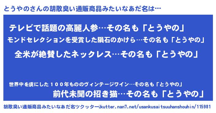 | 意味不明あだ名 | 『とにかく怪しいとうやの』 |