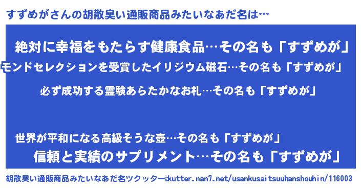 | 意味不明あだ名 | 『ペロリンすずめが』『永久保存すずめが』 |