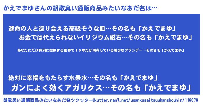 | 意味不明あだ名 | 『住所不定無職かえでまゆ(98歳)』 |