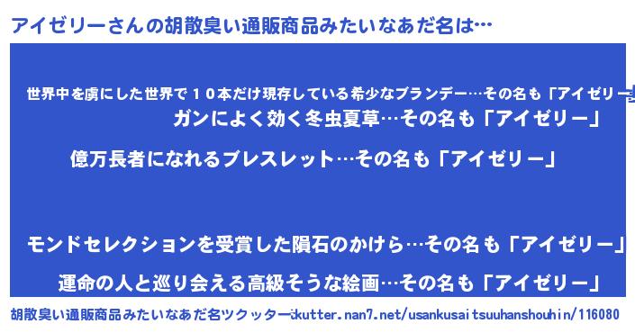 | 男性向けラノベタイトル風あだ名 | 『アイゼリー~年齢イコール彼女いない歴の魔法使い~』 |