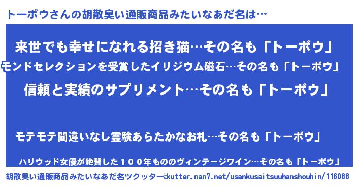 | 意味不明あだ名 | 『とにかく怪しいトーボウ』 |