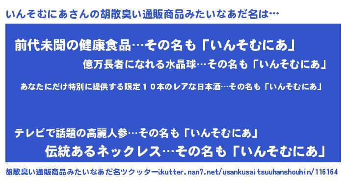 | 意味不明あだ名 | 『住所不定無職いんそむにあ(50歳)』 |
