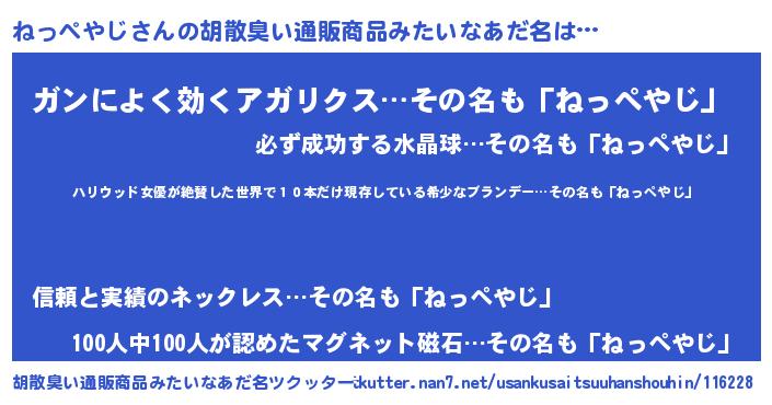 | 意味不明あだ名 | 『住所不定無職ねっぺやじ(93歳)』 |