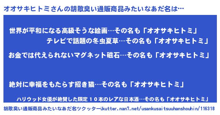 | 男性向けラノベタイトル風あだ名 | 『おまえをオタクにしてやるから、俺をオオサキヒトミにしてくれ! 』 |