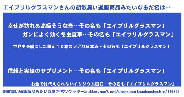 | 意味不明あだ名 | 『住所不定無職エイプリルグラスマン(53歳)』 |