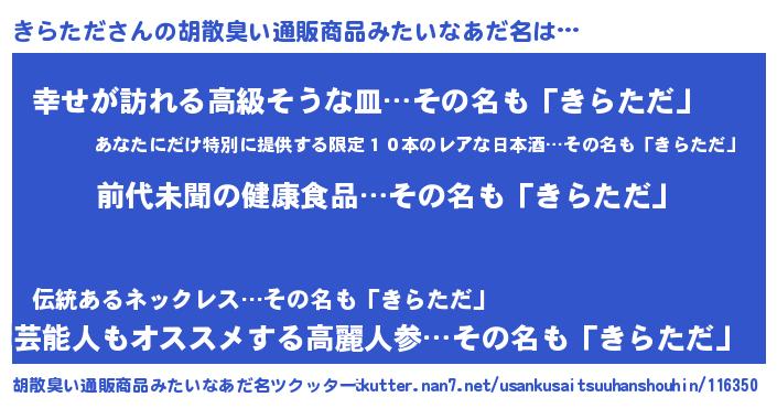 | ヘコむあだ名 | 『きらただ(笑)』『牛乳』『きらを』 |
