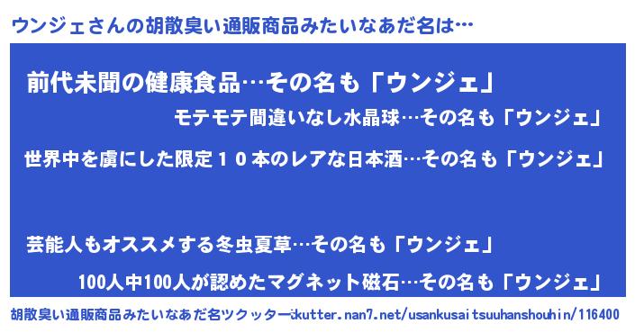 | 意味不明あだ名 | 『住所不定無職ウンジェ(50歳)』 |