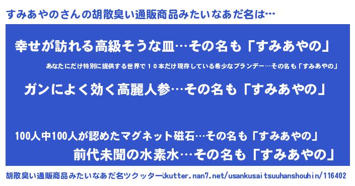 | 意味不明あだ名 | 『自称すみあやの』『ニラ科すみあやの属』 |