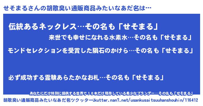 | ヒーロー風カッコイイあだ名 | 『慈愛の使者せそまる』『幻影騎士セソ』 |
