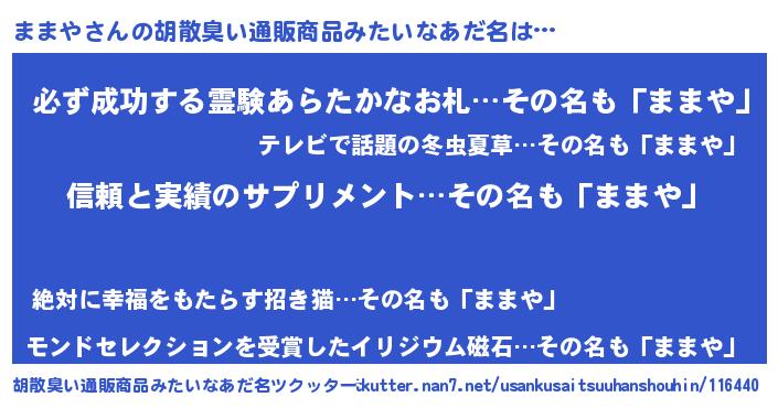 | 意味不明あだ名 | 『とにかく怪しいままや』『自称ままや』 |