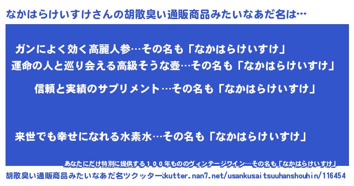 | 男性向けラノベタイトル風あだ名 | 『ダンジョンになかはらけいすけを求めるのは間違っているだろうか』 |