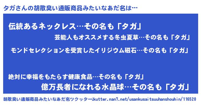 | 男性向けラノベタイトル風あだ名 | 『タガに滅ぼされるだけの簡単なお仕事です』 |