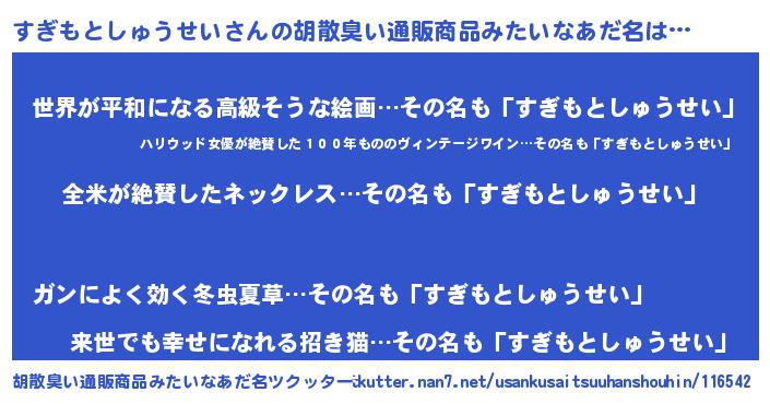 | 男性向けラノベタイトル風あだ名 | 『すぎもとしゅうせいに滅ぼされるだけの簡単なお仕事です』 |