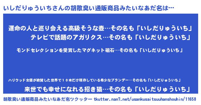 | 男性向けラノベタイトル風あだ名 | 『いしだりゅういちに滅ぼされるだけの簡単なお仕事です』 |