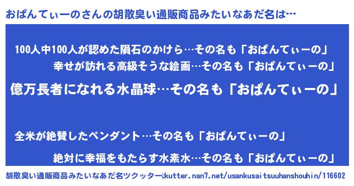 | 男性向けラノベタイトル風あだ名 | 『オパンティーノアートオンライン』 |