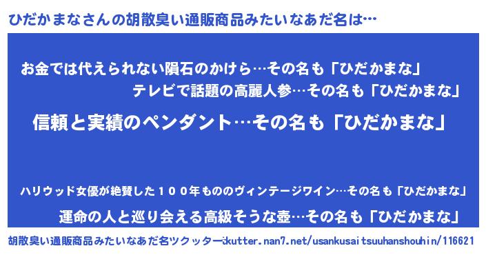 | 男性向けラノベタイトル風あだ名 | 『ヒダカマナスレイヤー』 |