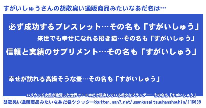 | 男性向けラノベタイトル風あだ名 | 『スガイシュウスレイヤー』 |