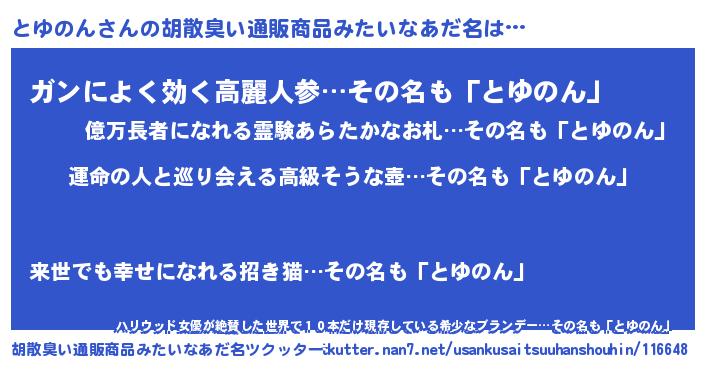 | 意味不明あだ名 | 『とゆのんフォーエバー』『自称とゆのん』 |