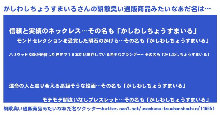 | 伝説のあだ名 | 『孤高の遊び人かしわしちょうすまいる』 |