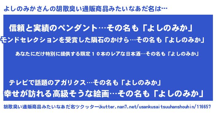 | 男性向けラノベタイトル風あだ名 | 『よしのみか~年齢イコール彼女いない歴の魔法使い~』 |