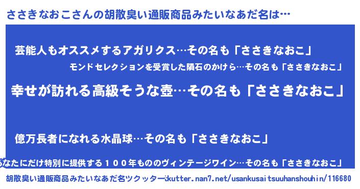 | 男性向けラノベタイトル風あだ名 | 『やはりささきなおこの青春ラブコメはまちがっている 』 |