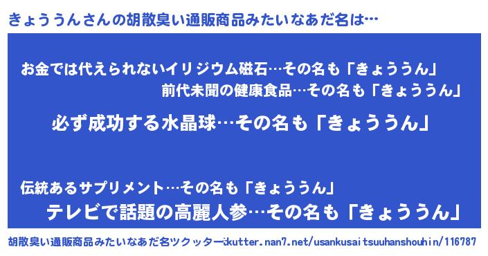| 男性向けラノベタイトル風あだ名 | 『きょううんの憂鬱』 |