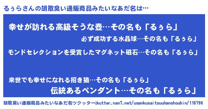 | 肩書あだ名 | 『るぅら教授』『るぅら大統領』 |