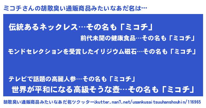 | ヘコむあだ名 | 『ミコ太郎』『豆乳』『ミコにゅー』 |