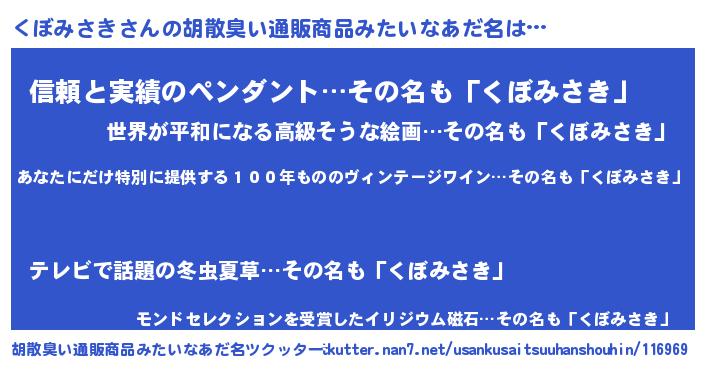 | 男性向けラノベタイトル風あだ名 | 『この素晴らしい世界にくぼみさきを!』 |