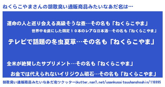 | 男性向けラノベタイトル風あだ名 | 『Re:ねくらこやまから始める異世界生活』 |